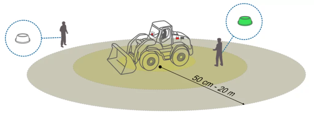 Typowe zastosowanie to ostrzeganie operatora wózka o wkroczeniu pieszego w strefę niebezpieczną. Gdy pracownik z czujnikiem znajdzie się w zasięgu aktywatora zamontowanego na wózku, system natychmiast uruchamia sygnalizację: lampkę LED, buzzer lub oba jednocześnie.
